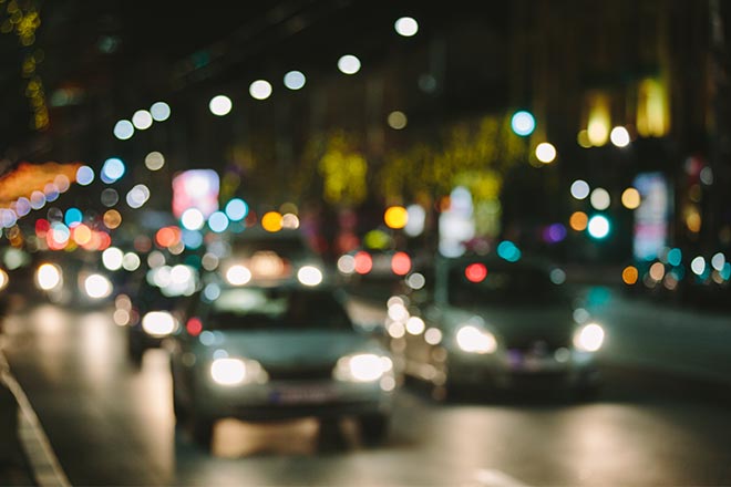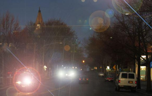 - Glare from headlights, lamps, or sunlight, with a halo around the lights in some cases