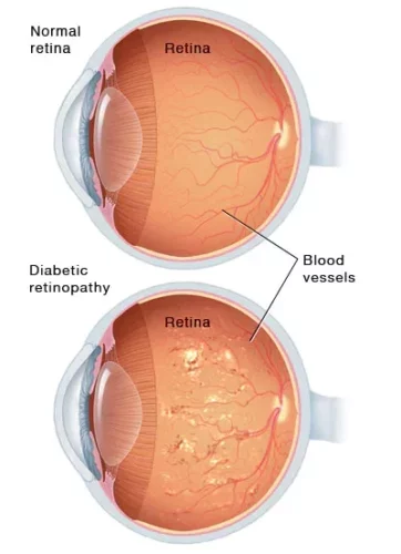 In diabetic retinopathy, the blood vessels in the retina get blocked and start leaking fluid. In others, irregular new blood vessels Irregular new blood vessels grow which lead to vitreous hemorrhage and retinal detachments. These changes result in vision loss and finally blindness.